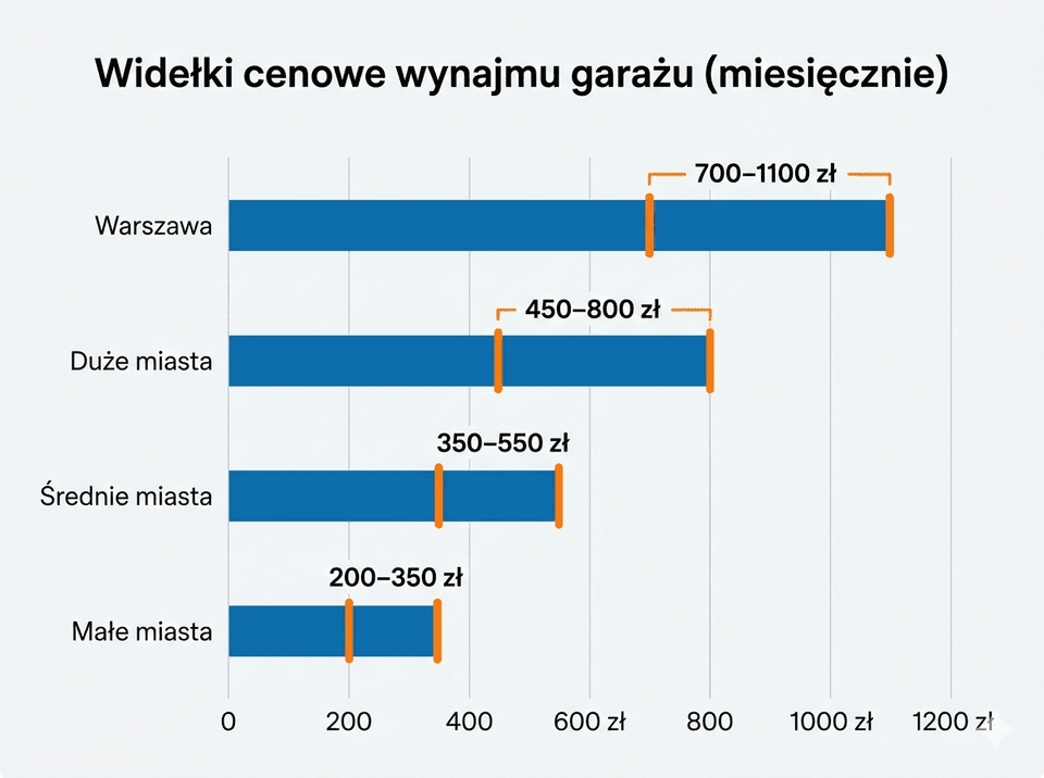 - Miasta średnie: często około 350 do 550 zł za garaż murowany.